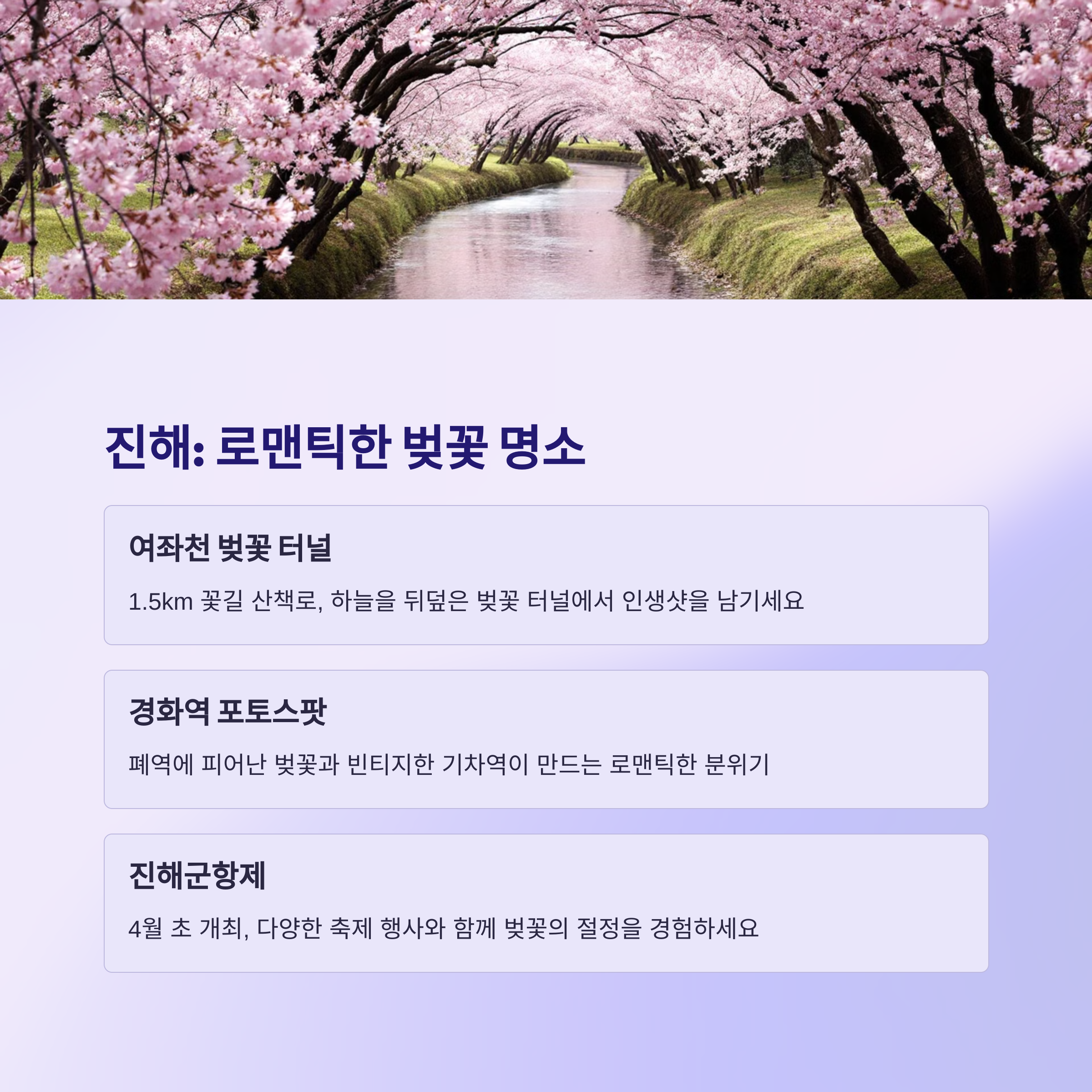 진해는 4월 초 군항제를 중심으로 전국 최대 규모의 벚꽃 축제가 열리는 곳입니다. 여좌천 벚꽃길은 드라마 촬영지로도 유명한 낭만적인 산책로로, 물 위로 늘어진 벚꽃 가지가 만들어내는 터널 속을 걷는 느낌이 인상적입니다.