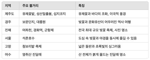 국내 봄 여행지 소개 테이블