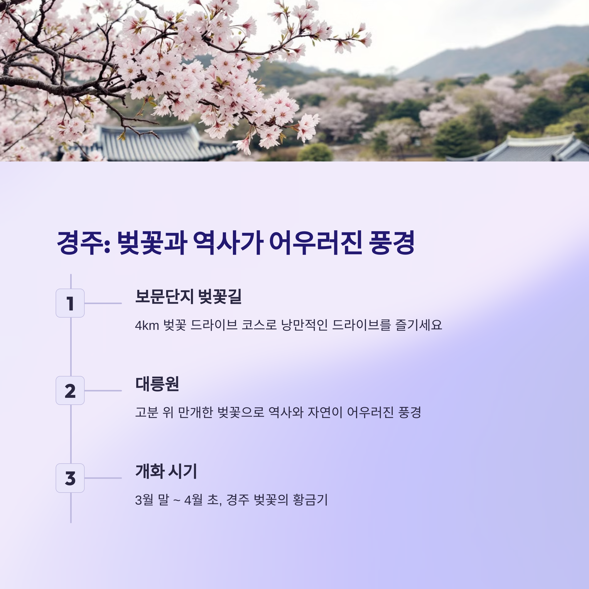 봄철 경주는 찬란한 벚꽃과 유서 깊은 문화유산이 어우러져 특별한 분위기를 자아냅니다. 가장 유명한 코스는 보문단지 벚꽃길과 대릉원 일대입니다.
